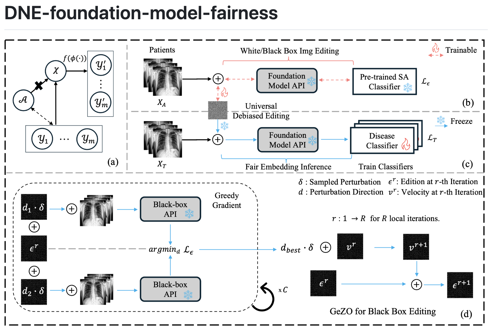 A novel debiasing strategy that mitigates spurious correlations in medical images through noise editing, enabling fairness-aware image processing for both white-box and black-box foundation model APIs.